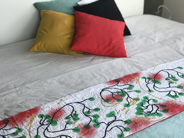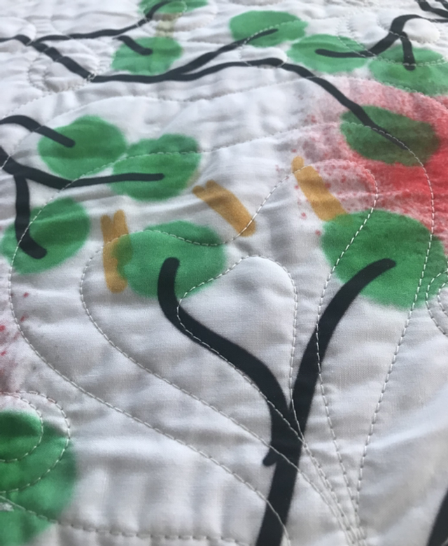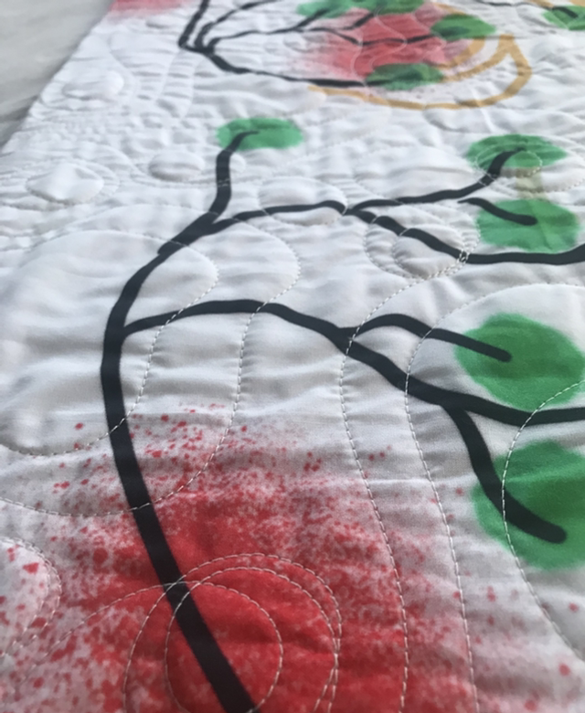 Un pied de lit fabriqué dans mon atelier en Occitanie, matelassé en quilting intuitif, avec des formes de coeurs/trefles. Le matelassage est réalisé sur cadre avec une machine à Quilter "Long Arm" (à bras long)