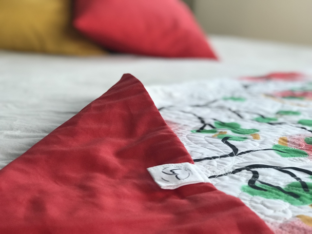 Pièce unique. Motifs exclusifs Colombe et Marguerite. 100% Coton Bio fabriqué en France, dessus coton imprimé exclusif Colombe et Marguerite, design par Edith Llorens, intérieur molleton coton, dessous coton rouge uni.