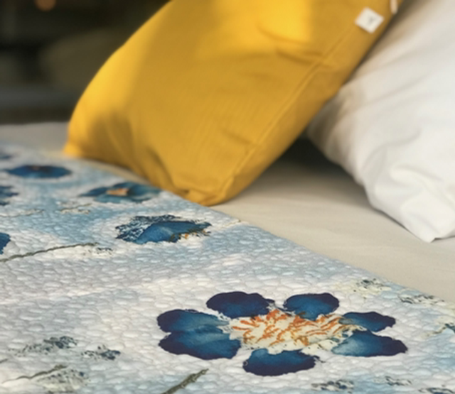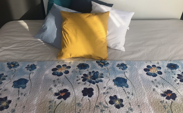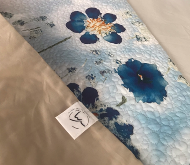 Pièce unique - Pied de lit matelassé nommé "Fleurs Bleues" - 180cm x 41cm - (Sans les coussins) - Coton bio Made in France