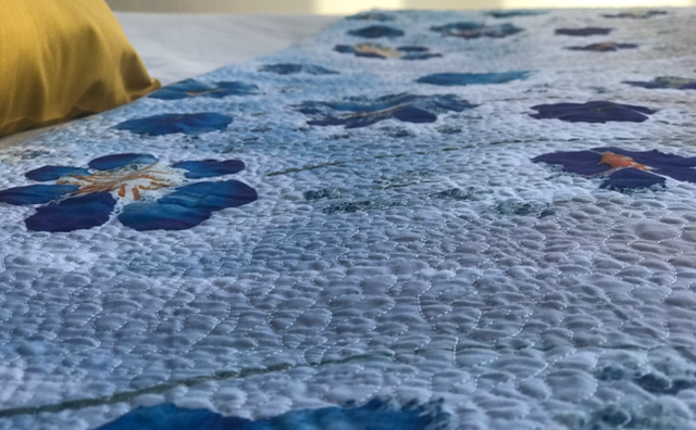 Un pied de lit fabriqué dans mon atelier en Occitanie, matelassé en quilting intuitif, avec des formes de coeurs/trefles. Le matelassage est réalisé sur cadre avec une machine à Quilter "Long Arm" (à bras long)